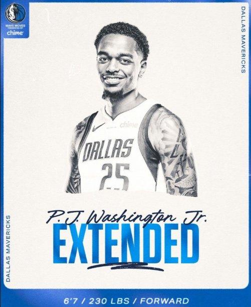 北京时间9月12日,达拉斯独行侠官宣,正式与球队主力前锋球员PJ-华盛顿完成续约。根据此前ESPN名记Shams报道,华盛顿与独行侠达成的是4年9000万美元的提前续约合同,且续约之日起有6个月的交易限制期。