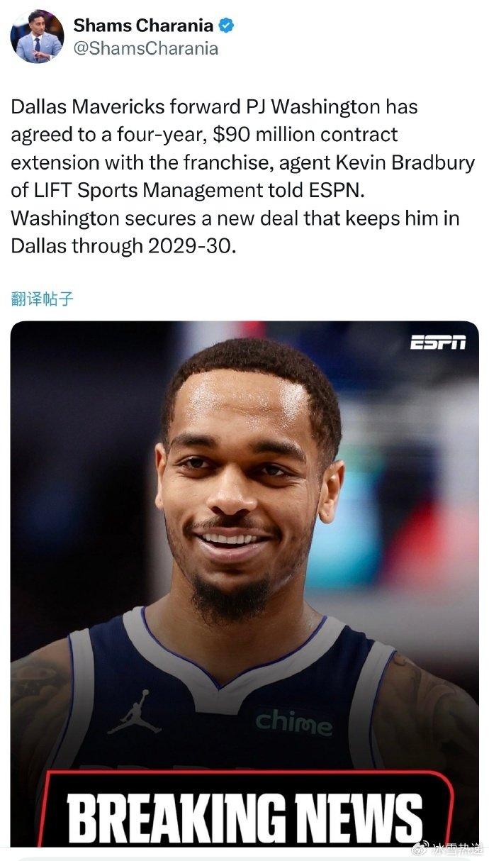 如今独行侠官宣与华盛顿完成提前续约,根据名记Shams报道,双方签约的是一份4年9000万美元提前续约合同。如此一来,华盛顿生涯总薪资将累计达到1.529亿美元。新赛季华盛顿有望成为独行侠冲击更高目标的重要球员之一。